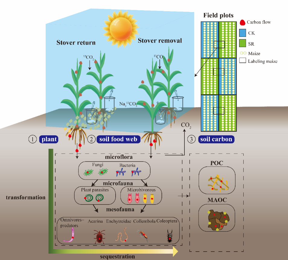 在应对全球气候变化与农业可持续发展的挑战中,如何通过农业管理措施提升土壤碳汇能力、优化碳循环过程,成为保障土壤生态功能与资源高效利用的核心问题。作物通过光合作用固定大气中的 CO₂(光合碳)是土壤碳固存的重要前体,而秸秆还田作为典型的保护性农业措施,既能补充土壤碳源与养分,又能激活土壤食物网。为此,中国科学院沈阳应用生态研究所土壤健康维持机制与生物调控途径创新组群在辽宁沈阳农田生态系统国家野外观测研究站,利用田间试验与13C同位素标记微区试验(图1),系统探究了秸秆还田条件下土壤食物网介导的光合碳转化及土壤碳固存的调控机制。