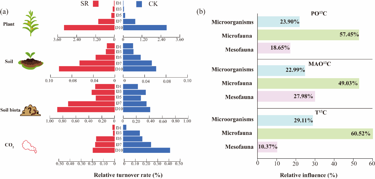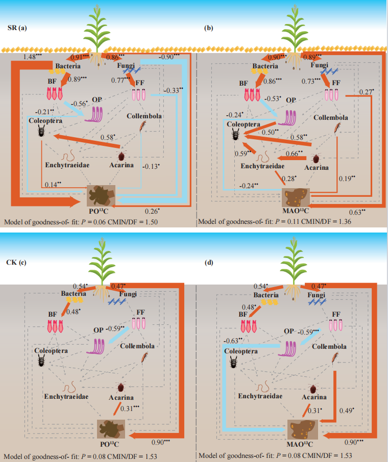 综上,该研究率先明确了“秸秆还田→土壤食物网重构→光合碳高效转化→土壤碳固存”的链式调控机制,证实秸秆还田通过激发效应与更新效应的协同作用,推动光合碳向土壤稳定碳库分配,且小型土壤动物在其中发挥核心调控作用。研究结果为优化保护性农业措施、提升农田土壤碳汇能力提供了关键的生物学依据,同时也为理解“地上—地下生态系统协同调控”机制提供了新视角。